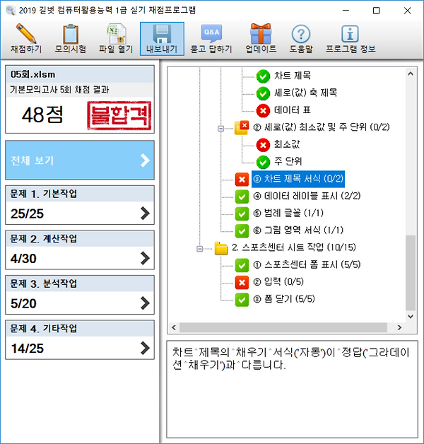 스펙 컴활 1급 실기-실전모의고사 5회(엑셀) 컴퓨터활용능력시험 1급 실기 - 엑셀 실전모의고사 5회 채점결과 *45분 시간제한 기본모의고사 5회 채점결과============================================================파일: 05회.xlsm총점: 73 (합격)============================================================ 문제 1. 기본작업 (25/25) └ 1. 외부 데이터 가져오기 (10/10) └ 외부 데이터 가져오기 └ 범위로 변환 └ 2. 조건부 서식 (5/5) └ 3. 고급 필터 (5/5) └ 4. 페이지 레이아웃 (5/5) 문제 2. 계산작업 (19/30) └ 1. 판매수량 계산 (4/4) └ 2. 상품수 계산 (4/4) └ 3. 변경코드 계산 (4/..